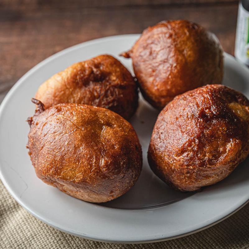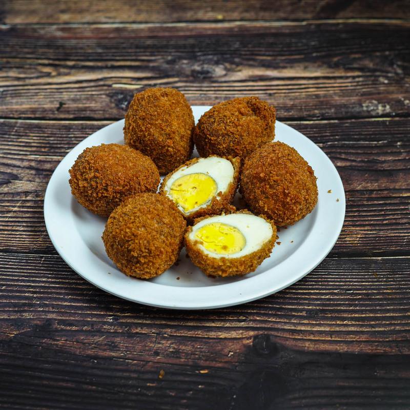 Boiled egg wrapped in seasoned deep fried turkey crust.