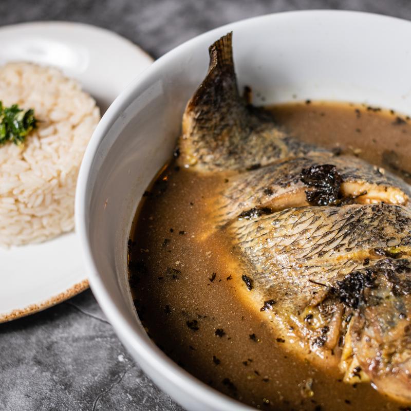 Spicy Nigerian-Style broth soup served with White rice. Protein choice for soup: (Meat) Chicken, Beef, Goat, Oxtail or Assorted Beef OR (Fish) Tilapia, Mackerel, Croaker or Catfish