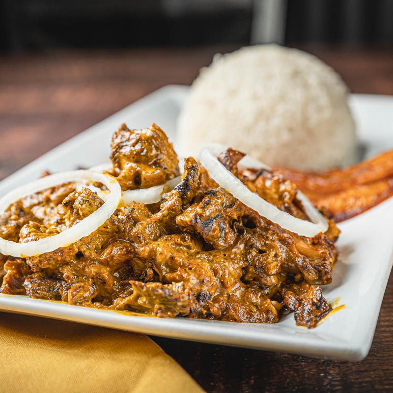 Spicy diced goat meat served with Plantain and rice. Choice of Jollof or White rice.