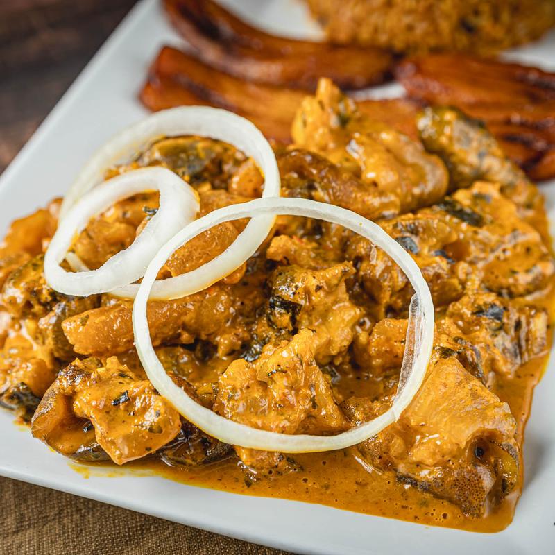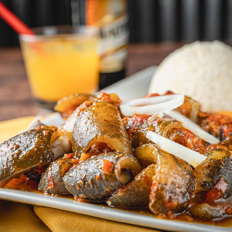 Cowfoot with Eastern Nigerian sauce served with Plantain. Choice of Jollof or White rice.