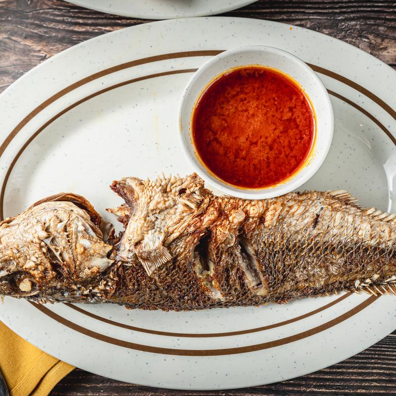 Steamed, Fried or Grilled Fish, seasoned with Cameroonian spices, served with Plantain and rice—choice of fish: Tilapia, Mackerel or Croaker. Options: Mild or Spicy